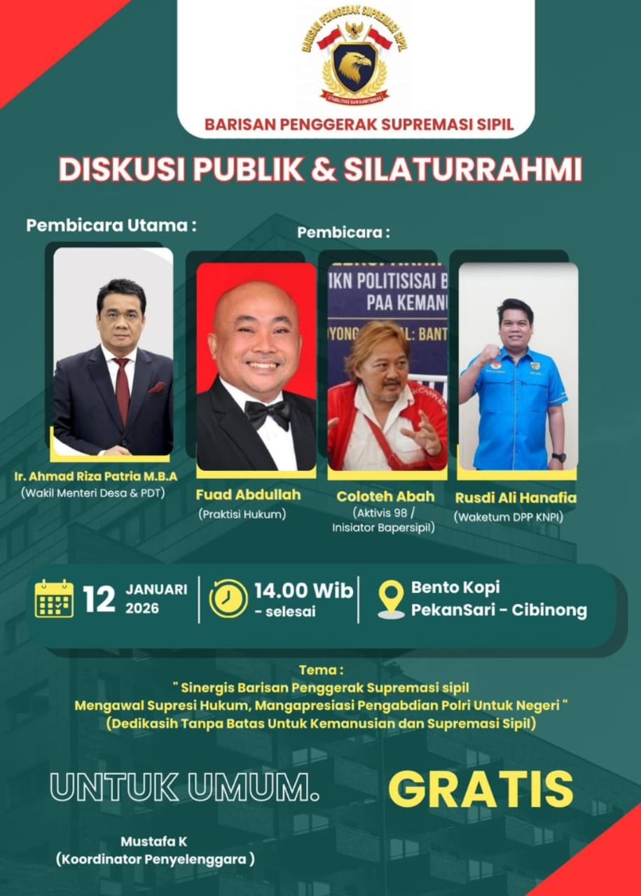 BOGOR – Barisan Penggerak Supremasi Sipil (BAPERSIPIL) akan menggelar Diskusi Publik dan Silaturrahmi pada Senin, 12 Januari 2026, bertempat di Bento Kopi, PekanSari, Cibinong, mulai pukul 14.00 WIB hingga selesai. Kegiatan ini terbuka untuk umum dan tidak dipungut biaya.
