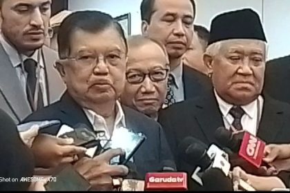 Wakil Presiden ke-10 dan ke-12 Republik Indonesia, Jusuf Kalla (JK), usai menyampaikan pidato pada pembukaan Forum Perdamaian Dunia ke-9 (World Peace Forum/WPF) di Kompleks Parlemen, Senayan, Jakar...