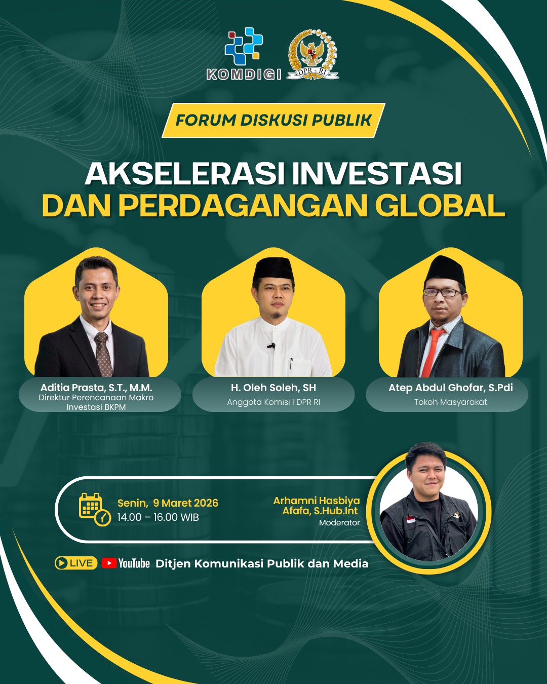 Dalam pemaparannya, narasumber menjelaskan bahwa akselerasi investasi dan perdagangan global merupakan upaya untuk mempercepat masuknya investasi lintas negara guna mendorong transformasi ekonomi, industrialisasi, serta meningkatkan daya saing Indonesia dalam perekonomian global. Indonesia memiliki berbagai potensi yang dapat menarik investor, di antaranya pasar domestik yang besar dengan jumlah penduduk lebih dari 280 juta jiwa, kekayaan sumber daya alam seperti nikel, bauksit, kelapa sawit, dan rempah-rempah, serta stabilitas makroekonomi yang relatif terjaga. Selain itu, bonus demografi dan keterlibatan Indonesia dalam kerja sama regional seperti ASEAN dan Regional Comprehensive Economic Partnership (RCEP) juga menjadi peluang besar dalam memperkuat perdagangan internasional.
